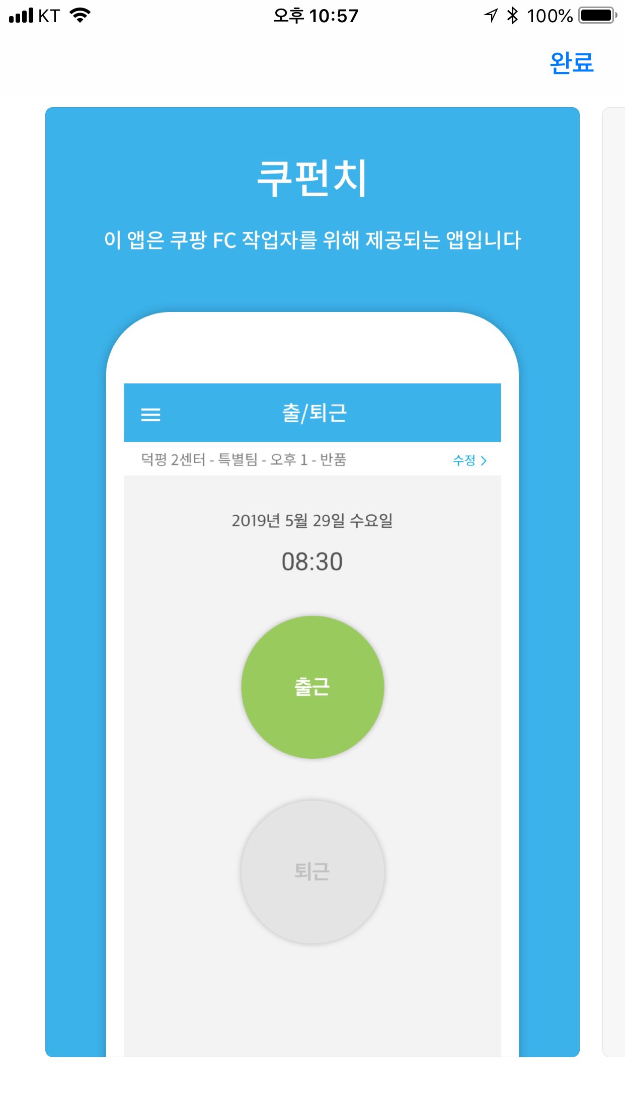 일 시작하기 전, 일 끝나고난 뒤 쿠팡 건물 내에서 출근 또는 퇴근을 눌러주면 완료입니다 ㅋ
