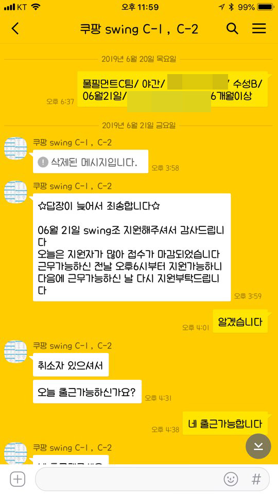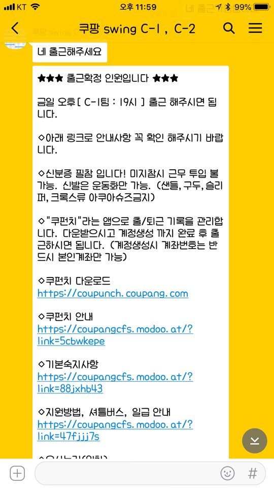 쿠팡 알바를 시작하고나서 한 3번~5번정도까지는 카톡으로 예약을 해야합니다.