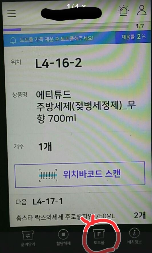 이런 식으로 계속 찍고 토트에 넣고 또 찾아서 선반찍고 상품찍고 피킹 반복인거죠~